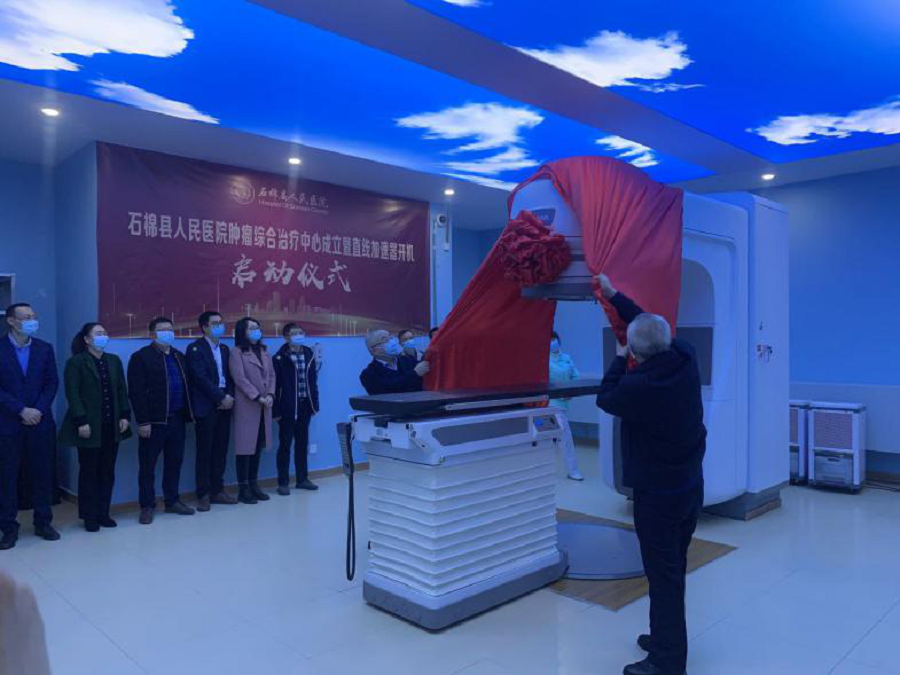仪式分三个部分举行。第一部分是直线加速器启动仪式,四川省妇女儿童医院副院长(主持工作)王刚、县人民政府副县长彭春雄、县卫健局局长赵志红、雅安市人民医院肿瘤科主任李自康、四川省肿瘤医院医师黄叶才,四川省肿瘤医院部分帮扶专家出席了活动,我院党总支书记李兴贵、院级领导、相关科室医护人员参加了活动。