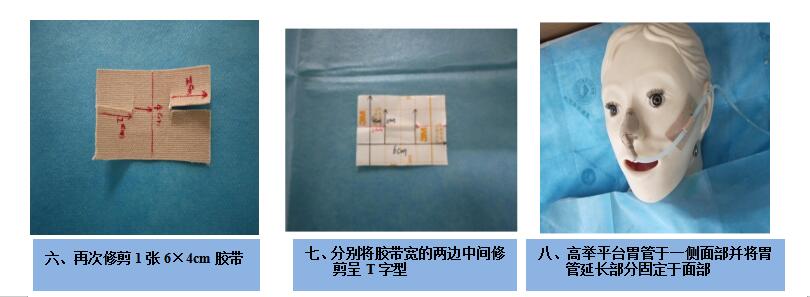 3.2.2 高举平台I型固定方法 按以上图示方法裁剪一张6×4cm的胶带,高举平台胃管延长部分粘贴于一侧面部,再将两侧剪开胶带从胃管下相互粘贴于面部。