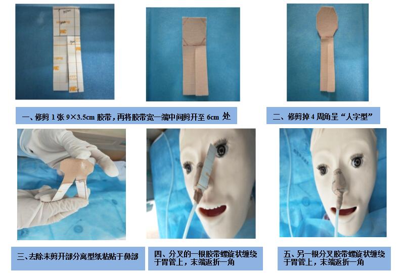 鼻胃管是维持昏迷、危重患者肠内营养的唯一通道[1],据相关文献报道胃管非计划拔管率占30.91%,可见鼻胃管安全有效固定及安全管理尤为重要。昏迷、危重患者留置鼻胃管后应给予有效、舒适美观的固定,以避免患者因不舒适或烦躁等原因自行拔管或管道因固定不牢而自行脱出,胃管脱出后,为了维持患者肠内营养需求,需再次置管或反复多次置管,都会增加患者置管的痛苦。留置鼻胃管传统固定方法固定胃管不牢固,美观舒适度差且固定胶布易松脱导致胃管自行脱出或因舒适度差而自行拔管,胃管非计划拔管率高,2019年我科使用3M粘着性棉布伸缩包袋进行相应尺寸裁剪,使用正确裁剪后的包袋对10例管道脱落高风险昏迷患者留置胃管进行人字型+高举平台I型固定[2,该种固定方法,舒适美观,粘贴温和持久,能有效避免留置鼻胃管脱落的发生,明显降低了非计划拔管率[3],该种留置鼻胃管固定方法明显优于传统固定方法,值得在临床推广与应用,现总结如下。