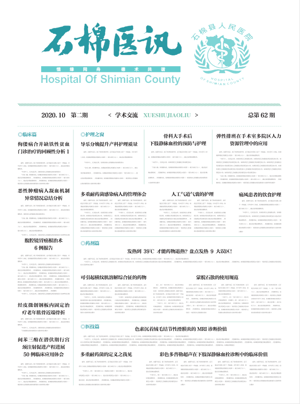2.3 静脉血栓药物预防是重要措施之一,术后8小时左右开始皮下注射低分子肝素3000 IU—5000IU、皮下注射、每日一次,用药时间一般为一周,用药期间密切观察全身各处以及切口部位有无出血发生,特别注意有无颅内出血的症状,同时监测凝血功能。有症状的患者要注意休息,勿用力排便,以防血栓脱落,及时进行溶栓治疗和生命体征的检测。鼓励多饮水或增加静脉输液量,减轻血液黏稠度。本组病例中有1例87岁的老年男性,以左股骨颈粉碎性骨折收入我科,入院时行四肢血管彩超检查显示:双侧股动脉、髂外动脉、腘动脉、胫前动脉、胫后动脉内中膜增厚伴粥样斑块形成,右侧股静脉静脉瓣功能降低。入院2周,术后第6日行四肢血管彩超复查显示:左侧肌间静脉血栓形成。给予积极治疗、护理,最终无血栓脱落等严重并发症的发生。